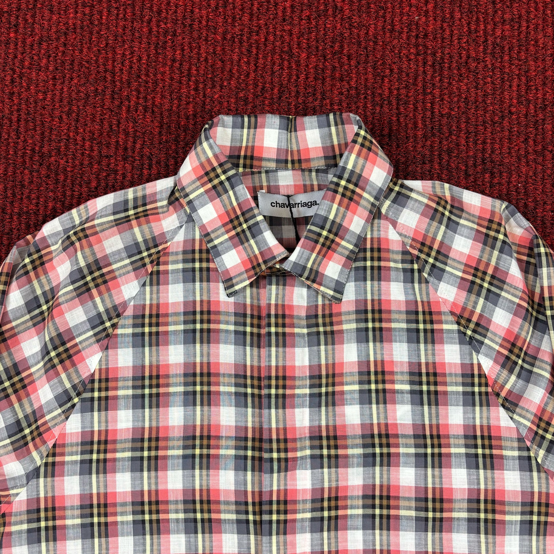 - Tessuto: Popeline leggero e fresco a Quadri (Plaid) sui toni del rosso/rosa, grigio e giallo. Tessuto di alta qualità con una caduta morbida.